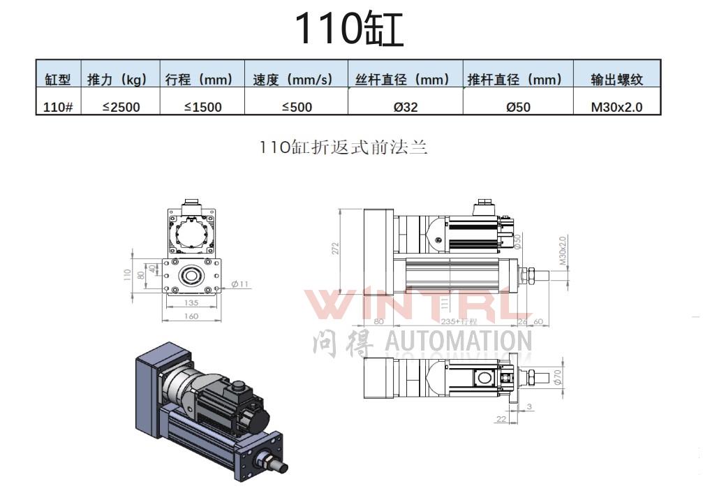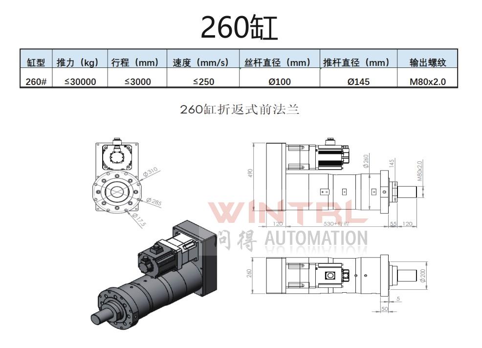 260缸 推力小于30000kg 行程小于3000mm 电机安装方式(折返、直连)电缸安装方式(前法兰、后法兰、脚座、耳轴)接受非标定制 |