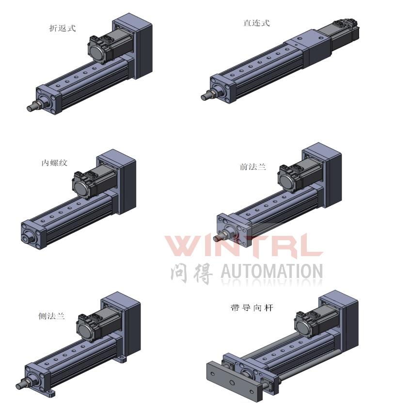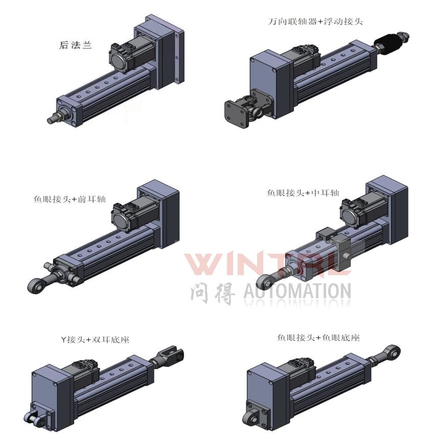 常规的 电动缸 安装形式有直连式和折返式,在直连式和折返式电动缸中又分为前法兰安装,脚座安装,尾部铰链安装等方式。特别注意的是电动缸端部杆端不能受较大的旋转力(厂家给出的额定最大推力都是直上直下的,就好像导轨能承受较大的负载但是不能承受旋转拧紧力的道理一样),所以如果有特殊应用形式需要选择我们的前导向安装型 电动缸。其他非标安装形式也可以定制,欢迎咨询。